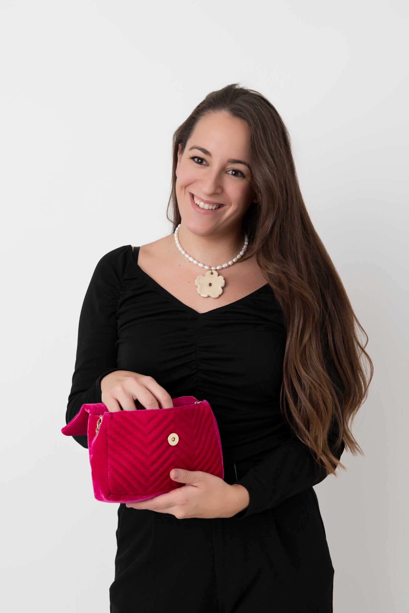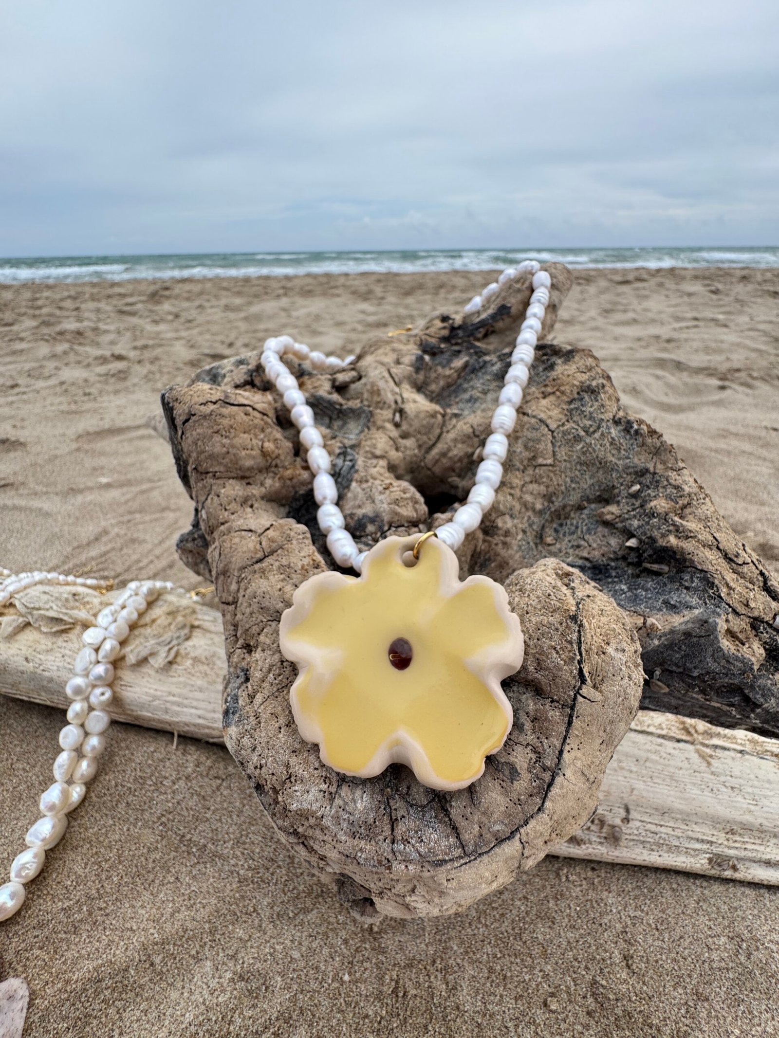 Necklace made of sweet pearls, stainless steel and polymer clay flower, crystals and resins.