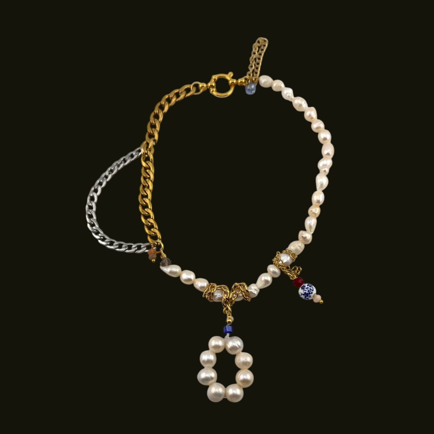 Made with freshwater pearls, glass, ceramic and stainless steel. Handmade.