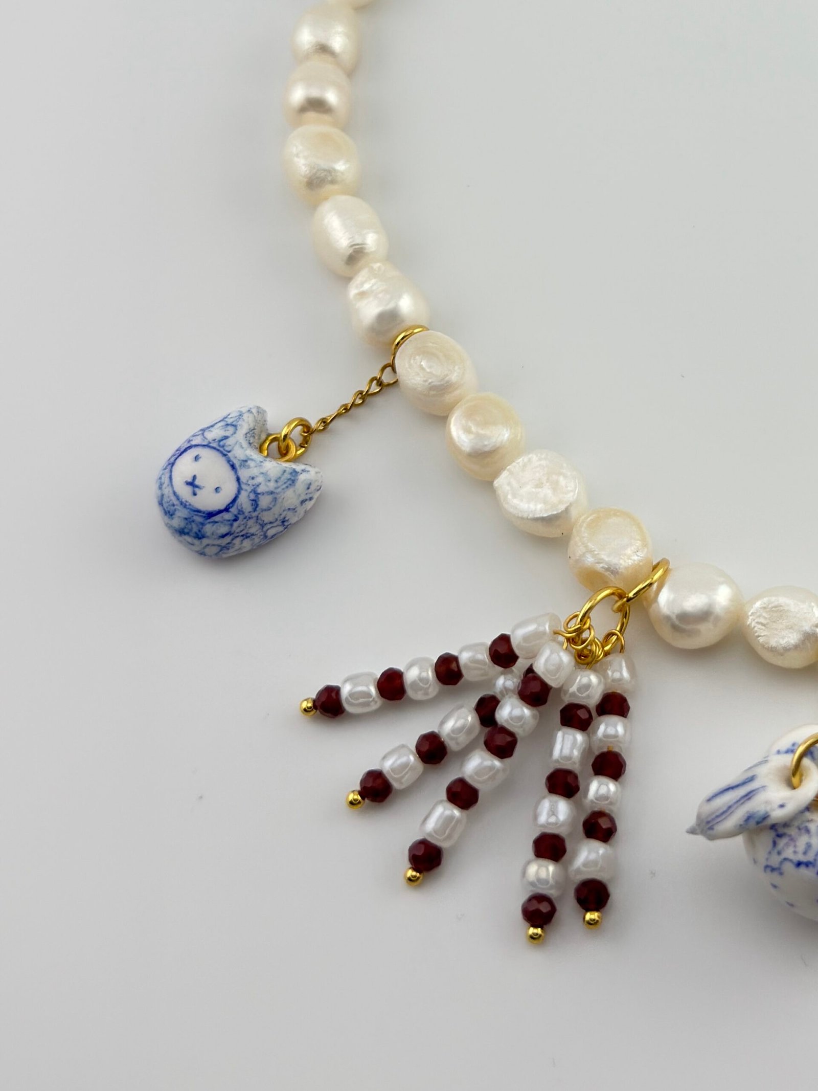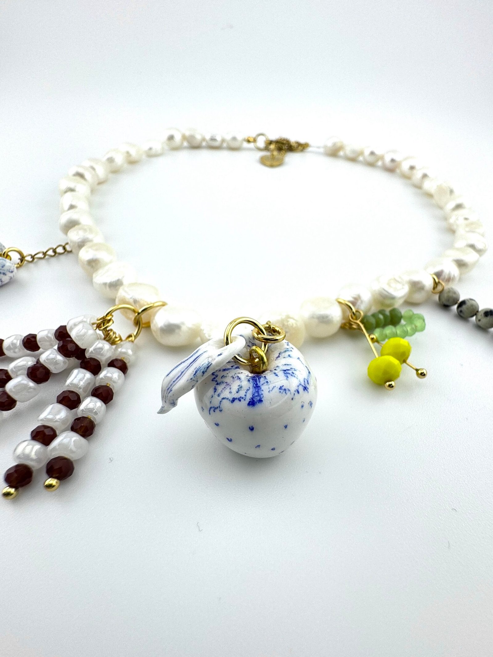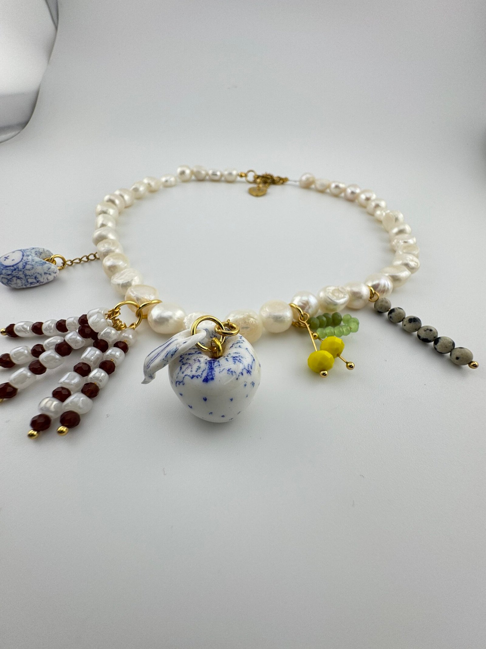 Perlas de agua dulce enlazados con acero inoxidable, vidrio templado, charms hechos a mano con arcilla y plástico reciclado.